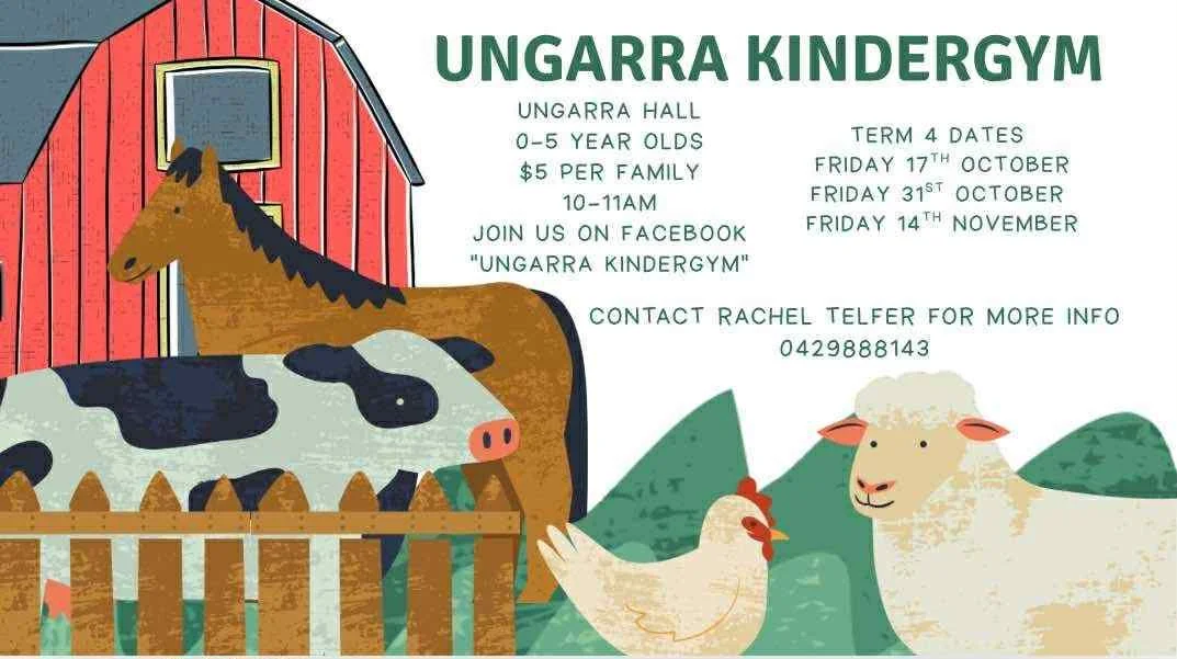 For more information see our Facebook page "Ungarra Kindergym" or contact Kaz Boehm 0428 745 997.